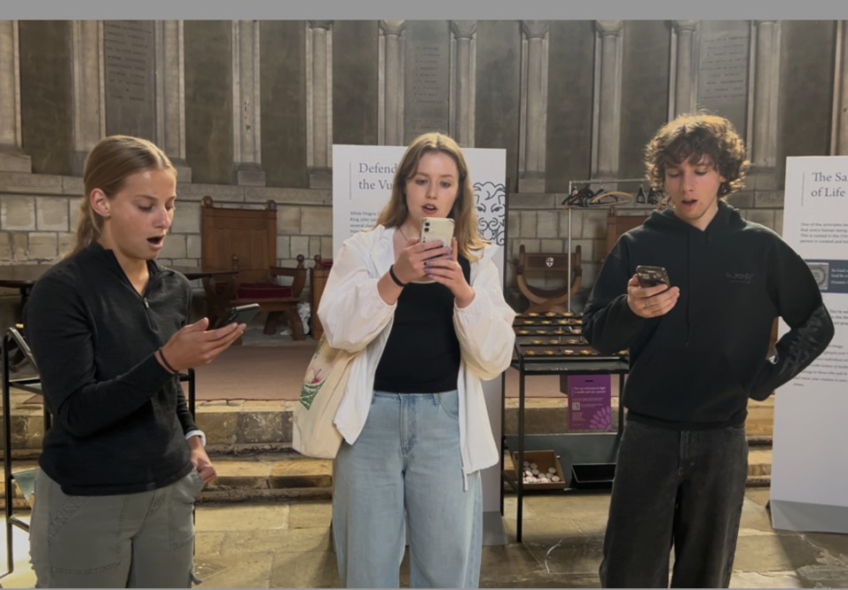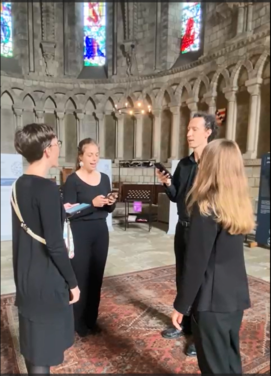 Erinn (left), Maya, Andy, and Erica sing a grateful farewell to Durham Cathedral and its Chapter House