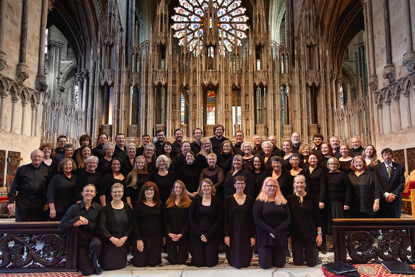 The Peterborough Singers at Durham Cathedral, 2025. Syd Birrell is in the second row on the far left, and organist Chris Denton is in the same row on the far right (in the tie)