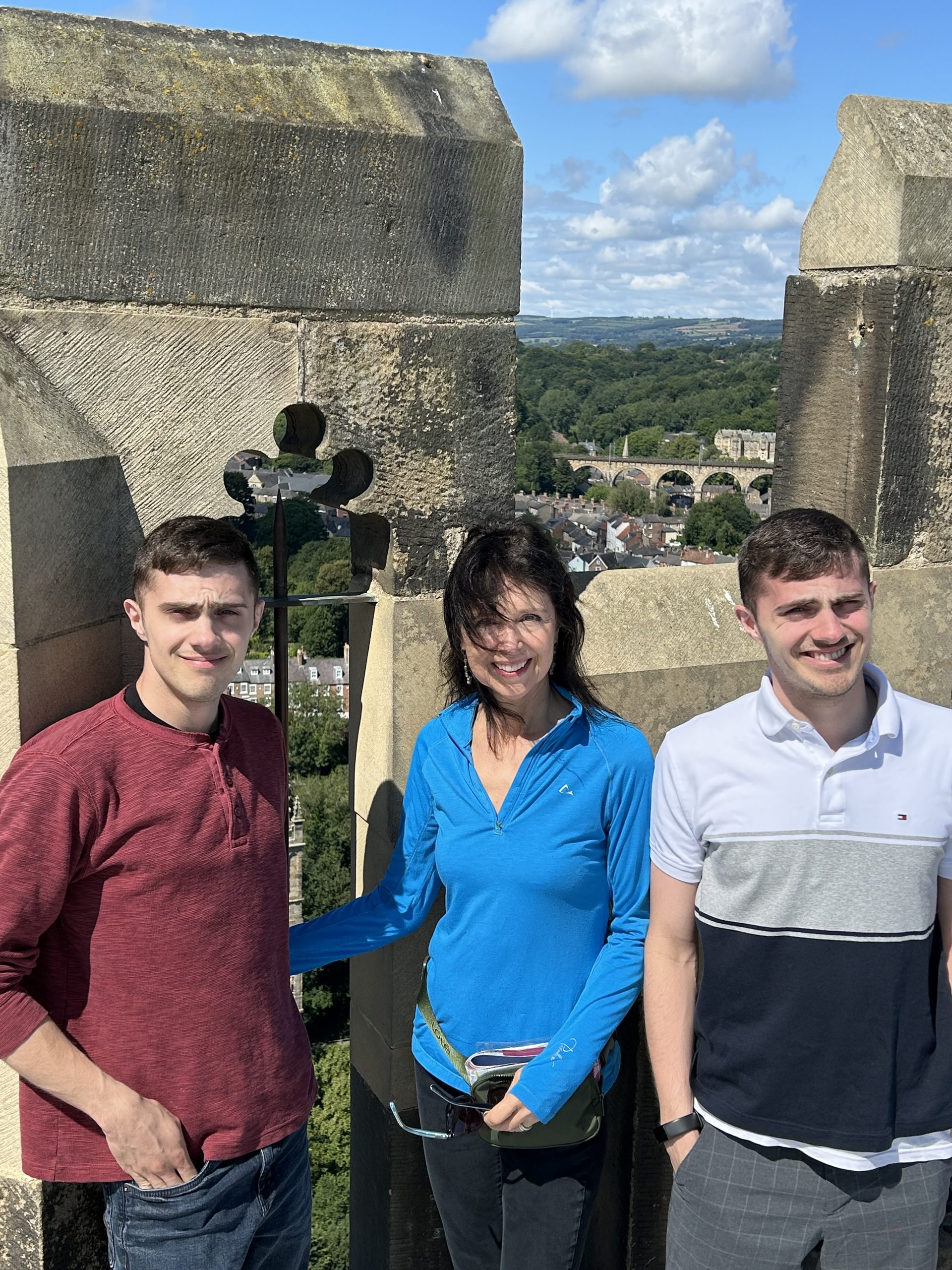 Andrew, Judy, and Ben on top of Durham Cathedral’s 218-foot tower, after climbing 325 steps!