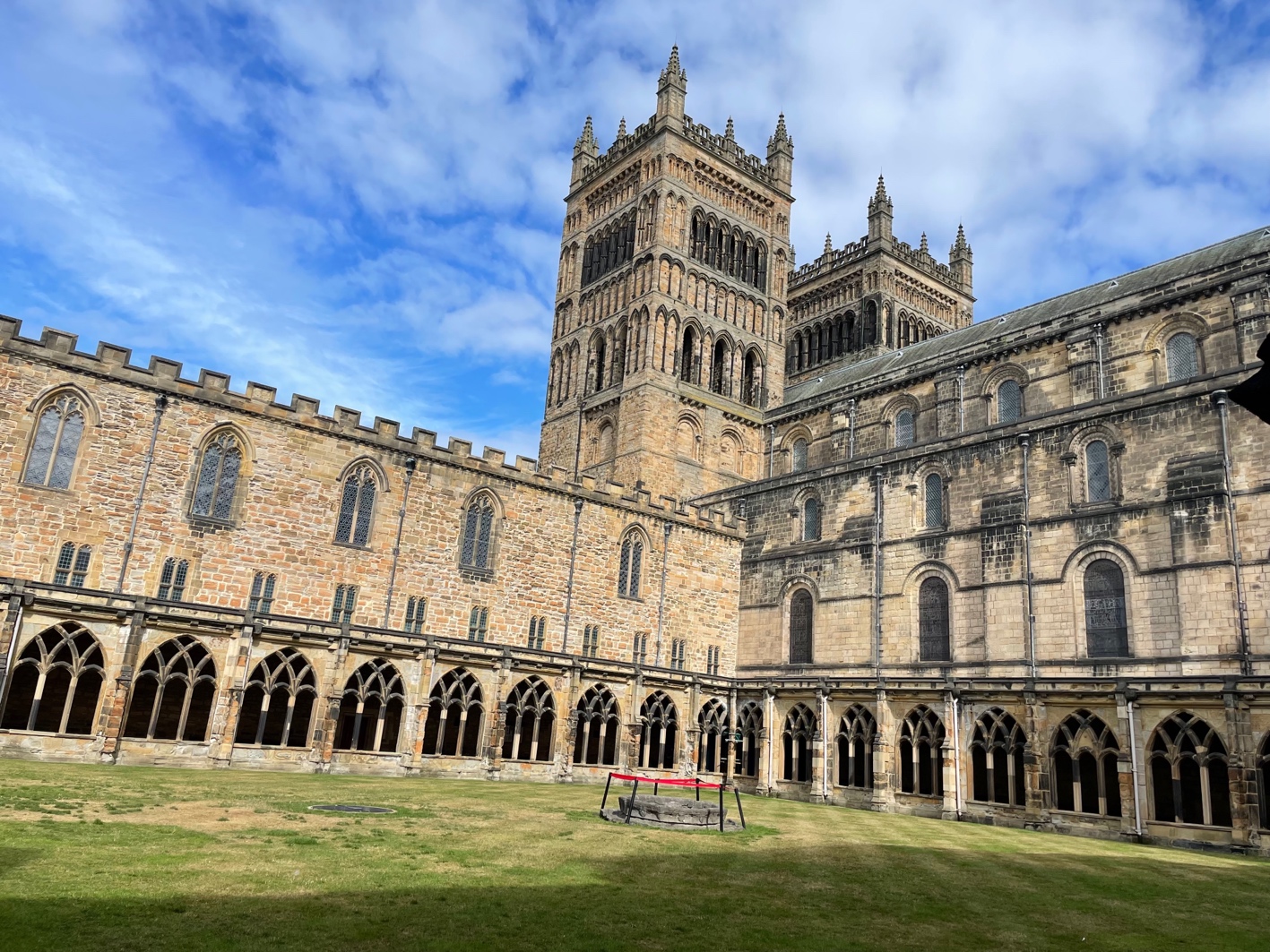 Between July 28 and August 3 of 2025, fifty-six Peterborough Singers, conducted by Artistic Director Syd Birrell, sang services at Durham Cathedral, the largest and finest example of Norman architecture in England, according to UNESCO. The Cathedral, constructed in the late 11th and early 12th centuries on a religious site that has been in use for over 1000 years, is a stone’s throw away from Durham Castle. Both of these places of secular and spiritual power sit on a great rock towering above a wooded horseshoe bend of the River Wear. Accompanying the choir were over a dozen supporters, friends and family who made the visit especially meaningful and fun. This delegation is by far the largest that the Singers have ever taken on an international trip, so you can imagine the remarkable efforts that went into planning, rehearsing, and trip-specific fundraising.